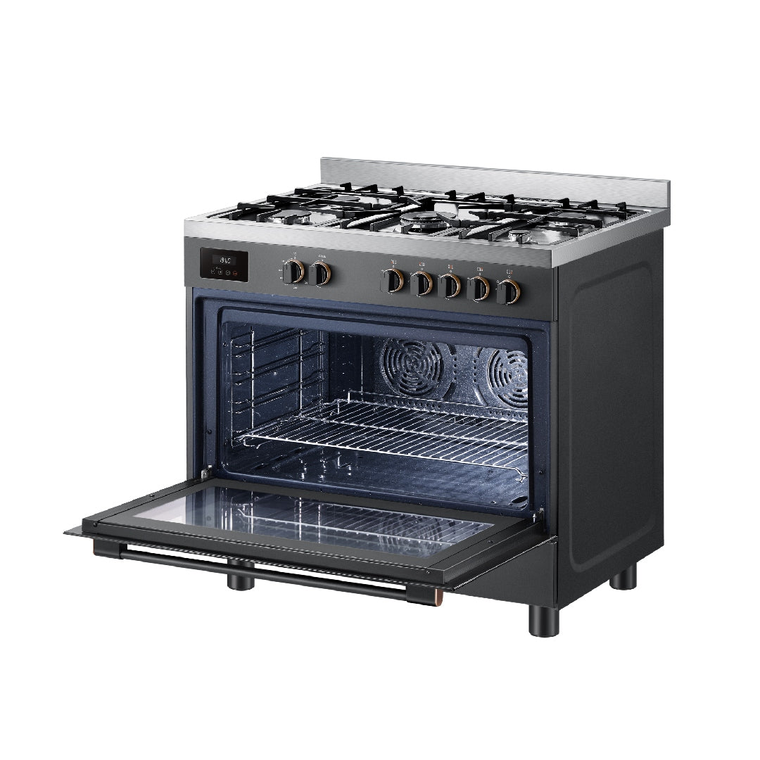 موقد غاز احترافي من توشيبا 5 شعلات 90×60 مع شواية دوارة ، باللون الرمادي الموراندي